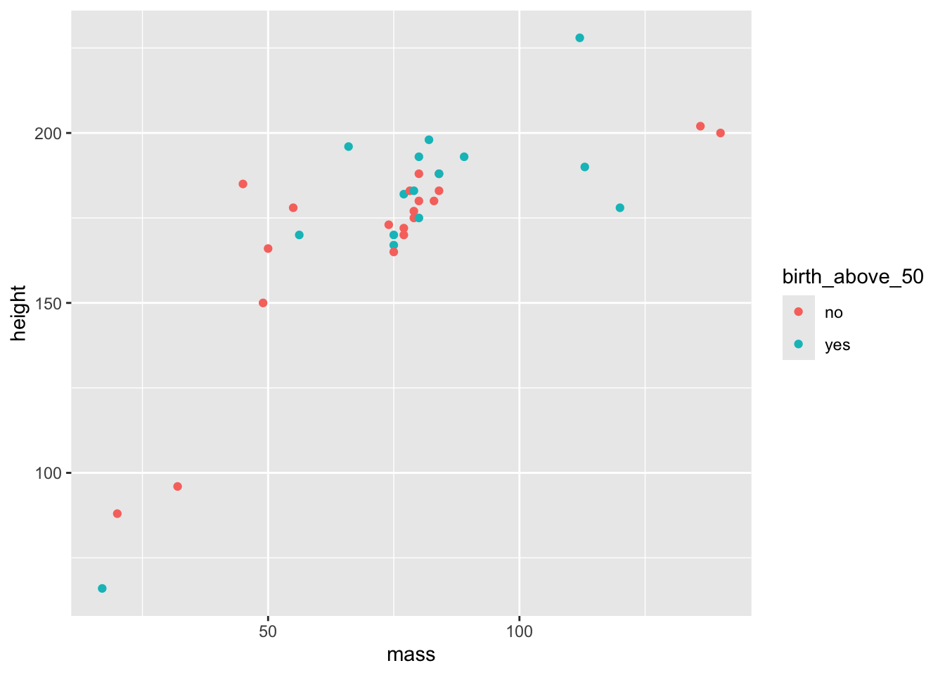 Now, let’s use the verbs to create a graph. We want to create a scatterplot with mass on the x-axis and height on the y-axis. Also, we want to add a third variable in the mix: whether the character’s birth year is hither than 50 or not (just for fun). Finally, we only want to show characters that have a mass lower than 200 and with a birth_year that is known.